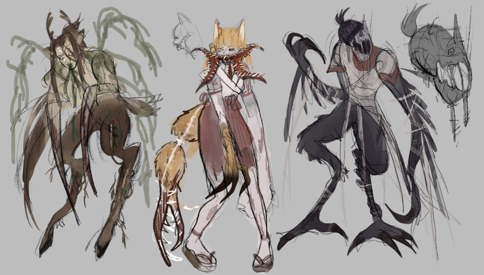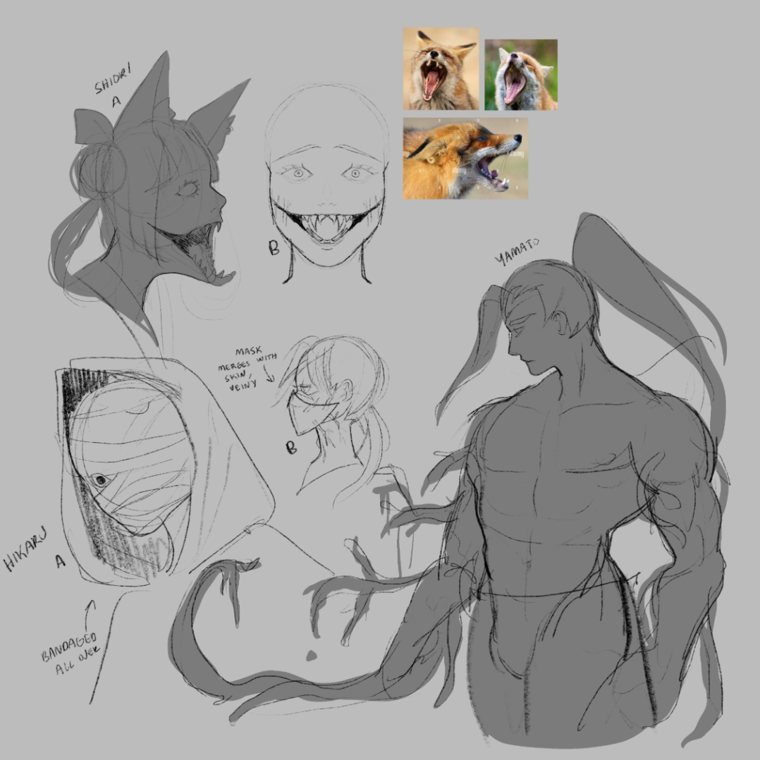 Having consumed a lot of horror media, I knew where to turn for some inspiration. Apart from our character’s key design elements, we also had a baseline using their animal features, as well as their major plot points in Onigashima. I intertwined all of this into my explorations for Yamato, Hikaru, and Shiori.