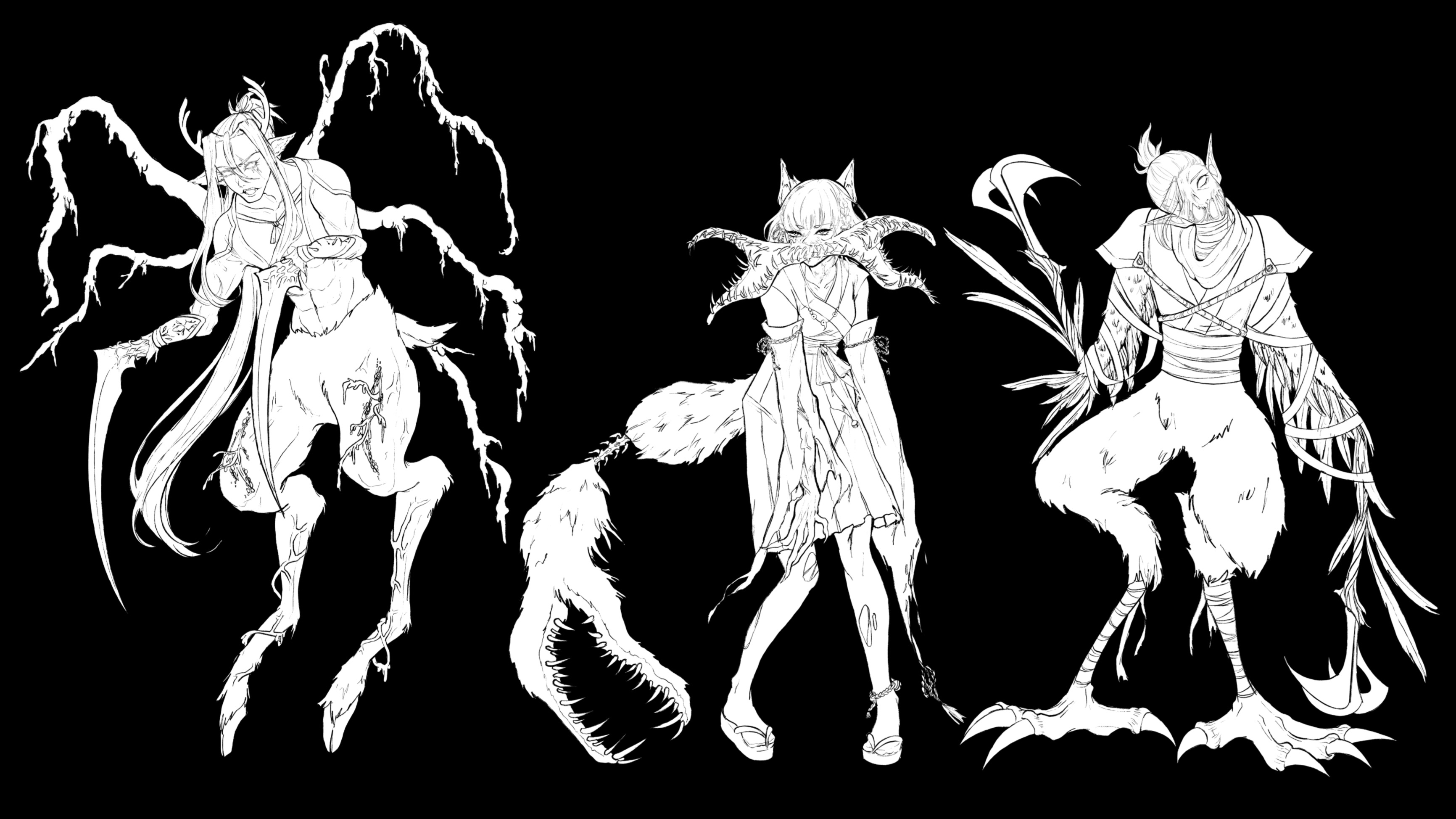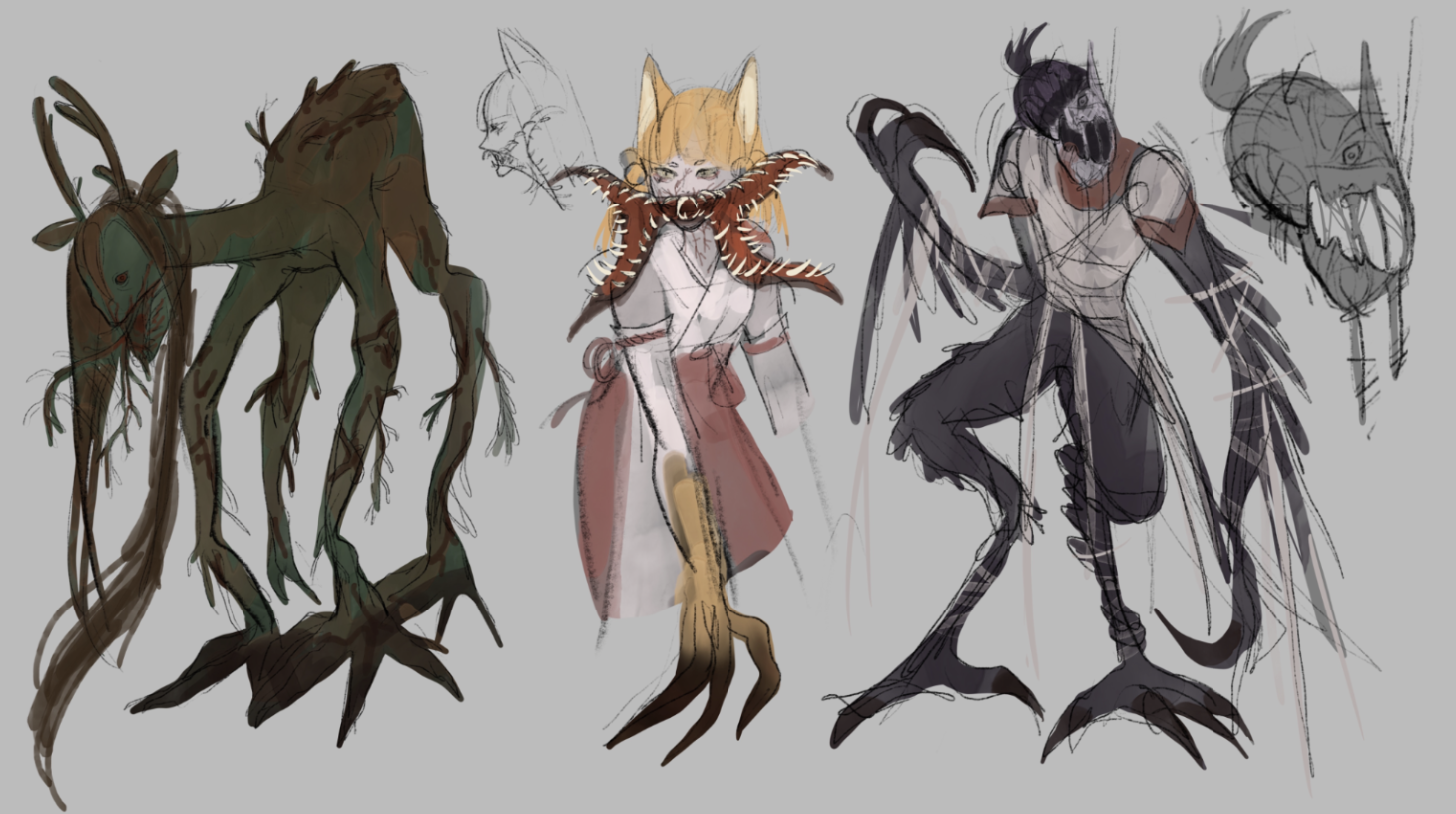 After reviewing Azure’s GDD and outlined concept for Onigashima, I was pretty excited to start ideating. I’m always tickled by concepts that involve heartbreak, gruesome monsters, and an exploration of moral compass and player’s choice. Azure passed me the reference images for our ghost form LIs and I instantly went, “Yep, this is gnarly. How can we lean into that?” There’s nothing more thrilling to me than creating a design that can disturb the comfortable (and equally, comfort the disturbed.) Let’s start with the monster designs.