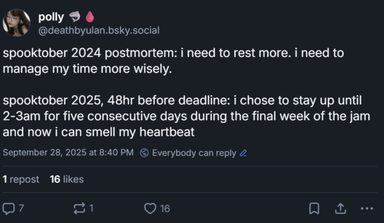 This is the part of the dev log where I talk about the progression of all my deliverables. If any of you recall how work went for my last Spooktober, I mentioned that I was going to take it easy and be more mindful of my time management and well-being.