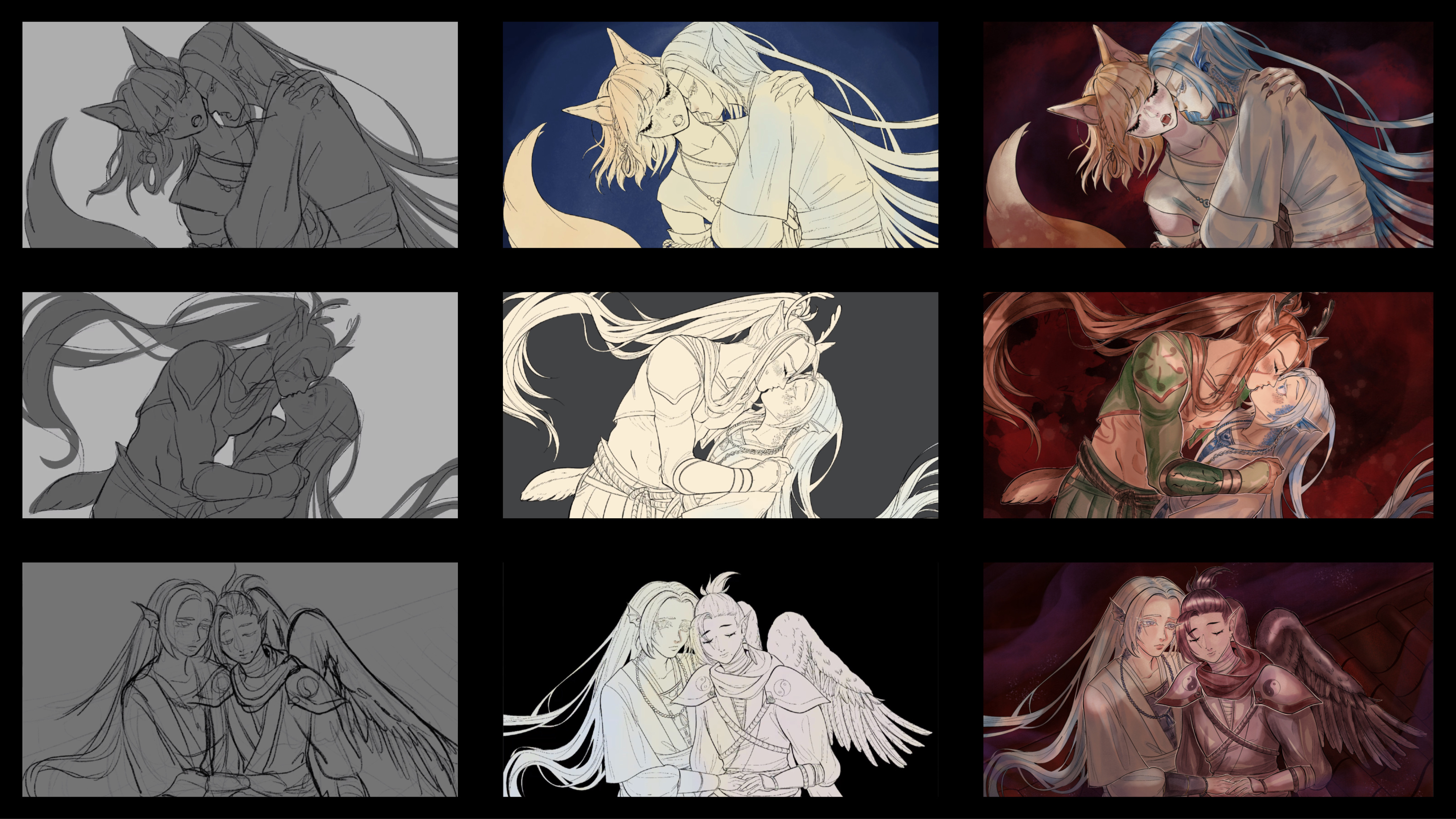 Here, you can observe how each CG progressed in render. I would start with the base color and texture of the canvas, then the base color for each character, and layer in the details. Finishing touches placed emphasis on the watercolor medium, using splotches, brushstrokes, and other similar textures you would achieve if painting traditionally.
